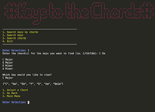 From the main menu, the user can search for either a key or chord. But primary function is searching for a key based on one or multiple chords entered. All the keys containing searched chords will be returned to the user.